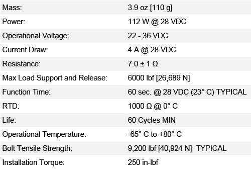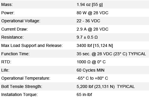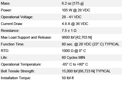 NEA® (Non-Explosive Actuators) — As with all of the TiNi™ product line, the Frangibolt® Actuator is non-pyrotechnic and field reset-able with a minimum qualified life of 60 cycles.